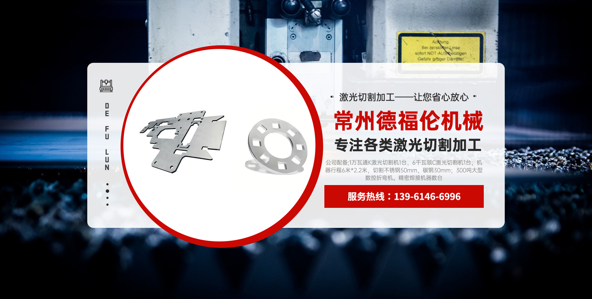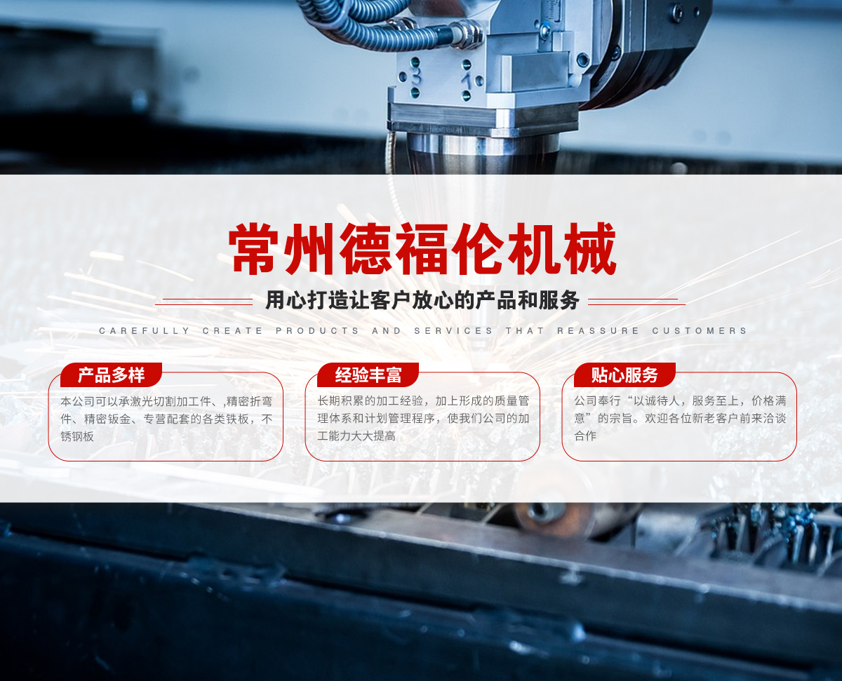 常州德福倫機械有限公司成立于2014年12月19號,位于江蘇省常州市武進區(qū)遙觀鎮(zhèn)建農(nóng)村劍童路56號西門;公司配備;1萬瓦通K激光切割機1臺,6千瓦領C激光切割機1臺;機器行程6米*2.2米,切割不銹鋼50mm,碳鋼30mm;300噸大型數(shù)控折彎機。精密焊接機器數(shù)臺。本公司可以承激光切割加工件、,精密折彎件、精密鈑金、專營配套的各類鐵板,不銹鋼板。長期積累的加工經(jīng)驗,加上形成的質量管理體系和計劃管理程序,使我們公司的加工能力大大提高,滿足客戶所需,是我們公司的目標!公司奉行“以誠待人,服務為上,價格滿意”的宗旨。歡迎各位領導;老總前來洽談合作!